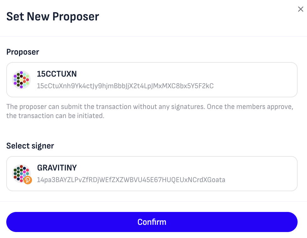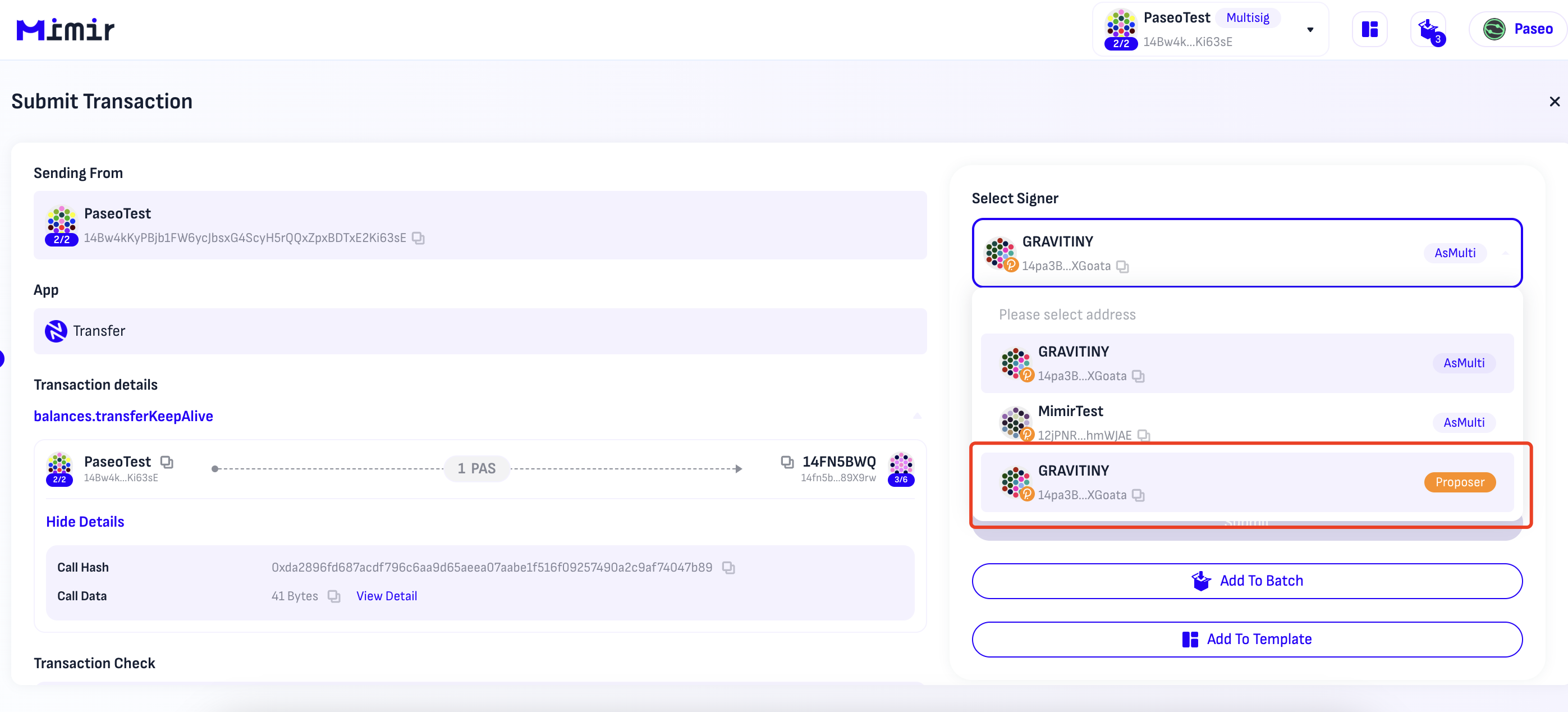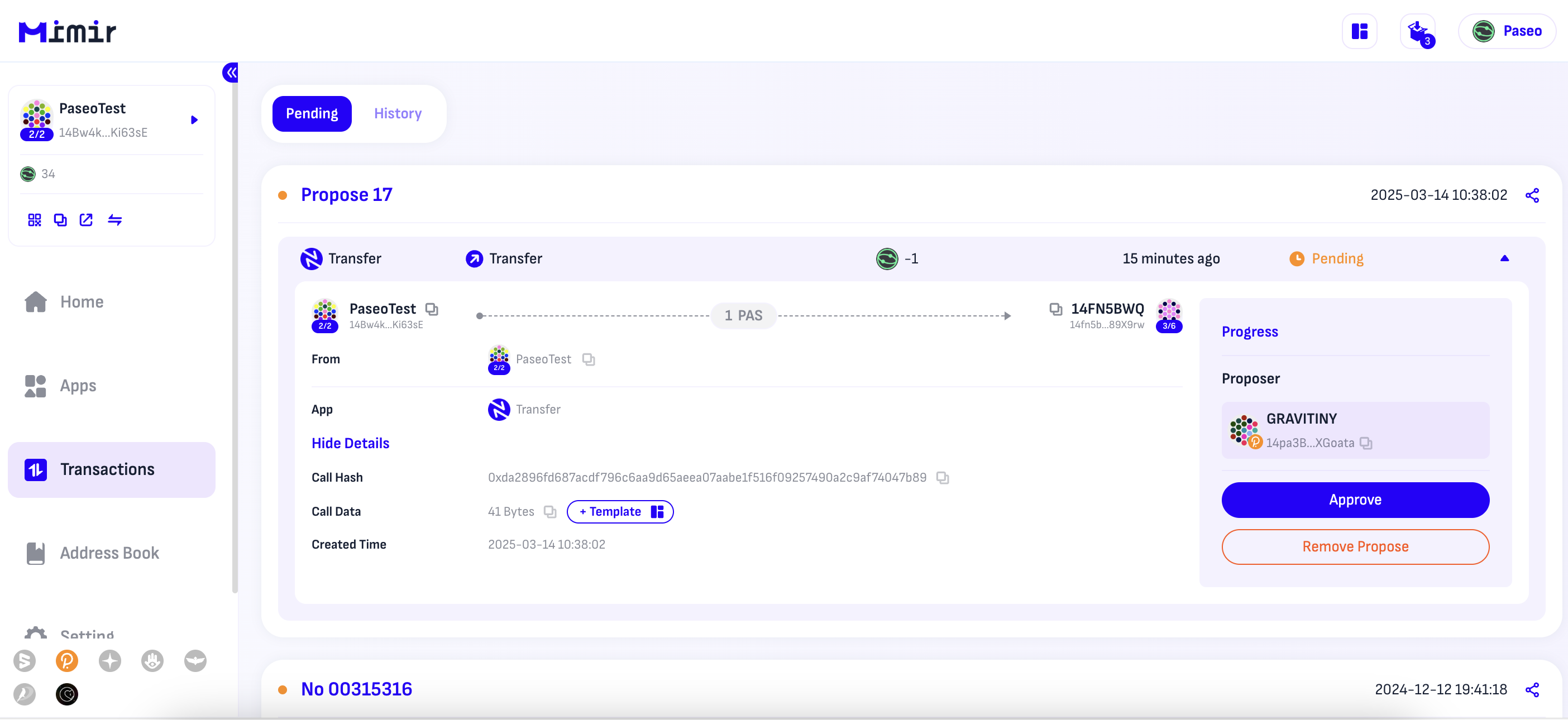 Transactions initiated by a proposer will be displayed in the **Pending** page in the format shown above.