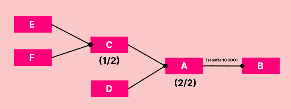 Given this setup, if there's a desire to initiate a transaction from A to B transferring 10 $DOT, any of the single-signature accounts E, F, or D can act as the initiator for this transaction.